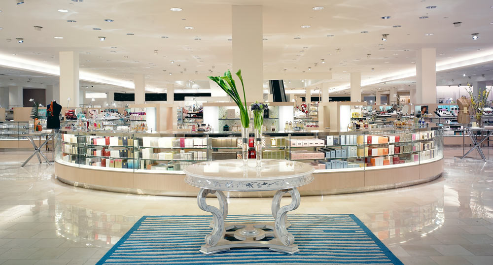 Luxurious fitting rooms are designed for customer convenience, accentuating unique amenities. The main escalator, placed in the light-filled, spacious, three-level atrium, carries shoppers upward through the store’s center for a panoramic look at all the merchandise areas.